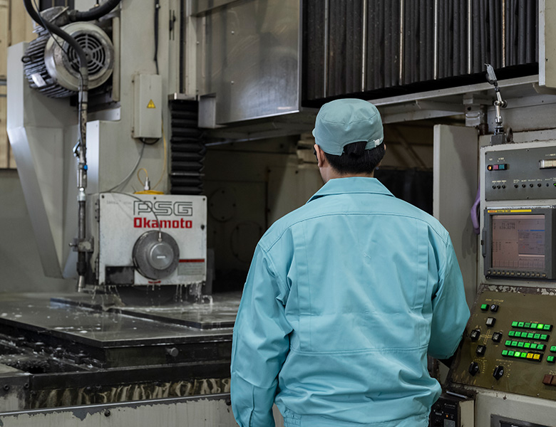 駒井技研では、県内でも導入例の少ない大型平面研削盤を保有しています。半導体製造装置や産業機械の大型部品においては、わずかな歪みや表面粗さも製品品質を左右しますが、当社の大型研削盤が高い平面度と平行度を実現。